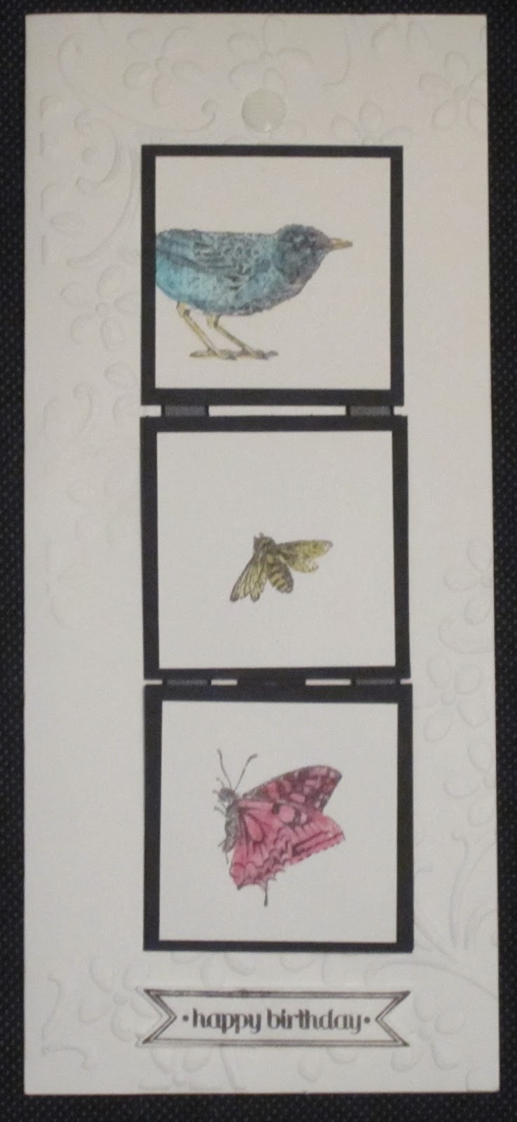 There are 4 versions of this next card that uses a white washing technique. First you emboss in white and then you take an aqua painter and dip it onto a whisper white craft ink pad and then paint the inside of the designs. Then you take markers and blender pens and color over the white in the designs. This is such an incredible technique... so simple, yet so elegant.